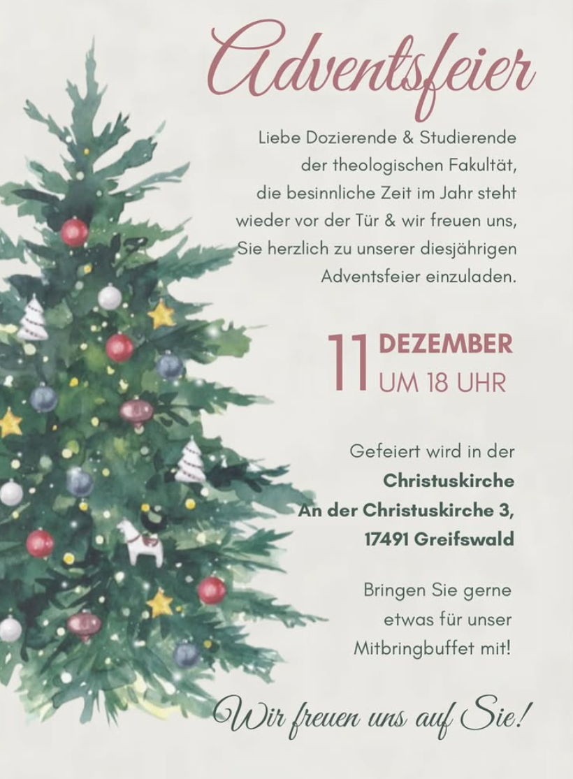 Adventsfeier 11.12.2025, 18:00 Uhr Hiermit laden wir Sie/Euch herzlich zu unserer diesjährigen Adventsfeier der Theologischen Fakultät am 11. Dezember um 18:00 Uhr in der Christuskirche ein.🎄✨Bitte tragt zum Mitbringbuffet bei🍪🍬Vorfreudige Grüße senden die Erstis Termin speichern Zurück zu allen Veranstaltungen