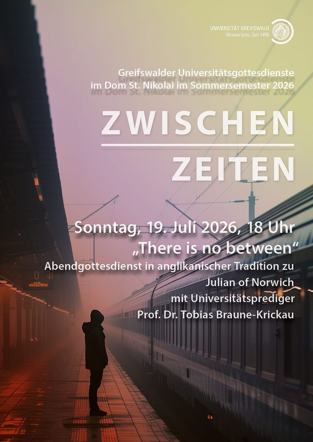 Semesterabschlussgottesdienst - „There is no between“ 19.07.2026, 18:00 Uhr Universitätsgottesdienst mit den Studierendengemeinden und Universitätsprediger Prof. Dr. Tobias Braune-KrickauAbendgottesdienst in anglikanischer Tradition zu Julian of Norwich mit Universitätsprediger Prof. Dr. Tobias Braune-Krickau VeranstaltungsortDom St. NikolaiDomstraße 5417489 Greifswald Termin speichern Zurück zu allen Veranstaltungen