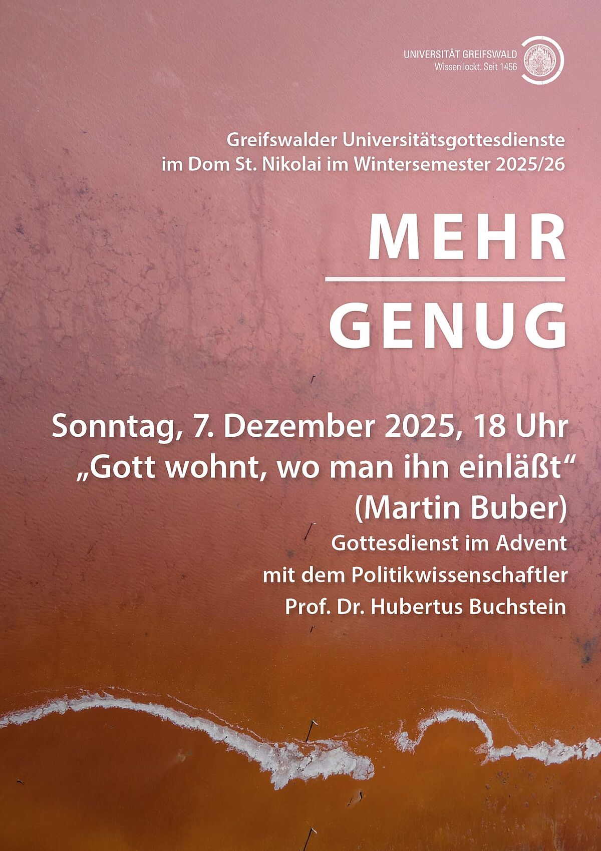 Universitätsgottesdienst - "Gott wohnt, wo man ihn einläßt" 07.12.2025, 18:00 Uhr Universitätsgottesdienst mit den Studierendengemeinden und Universitätsprediger Prof. Dr. Tobias Braune-KrickauGottesdienst im Advent mit dem Politikwissenschaftler Prof. Dr. Hubertus BuchsteinVeranstaltungsortDom St. NikolaiDomstraße 5417489 Greifswald Termin speichern Zurück zu allen Veranstaltungen
