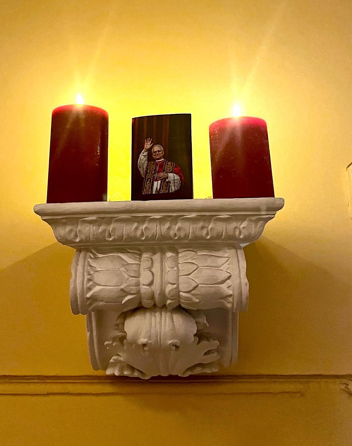 Nach Ende des offiziellen Programms wartete noch ein besonderes Highlight. Die Rudi wurde weiter verschönert: Links von der Schleiermacher-Büste wurde ein Bild von Karl Barth aufgestellt, rechts davon – zwischen zwei elektrischen Rossmann-Kerzen – die Grußkarte mit dem Bild des Papstes. Wahrlich gelebte Ökumene!